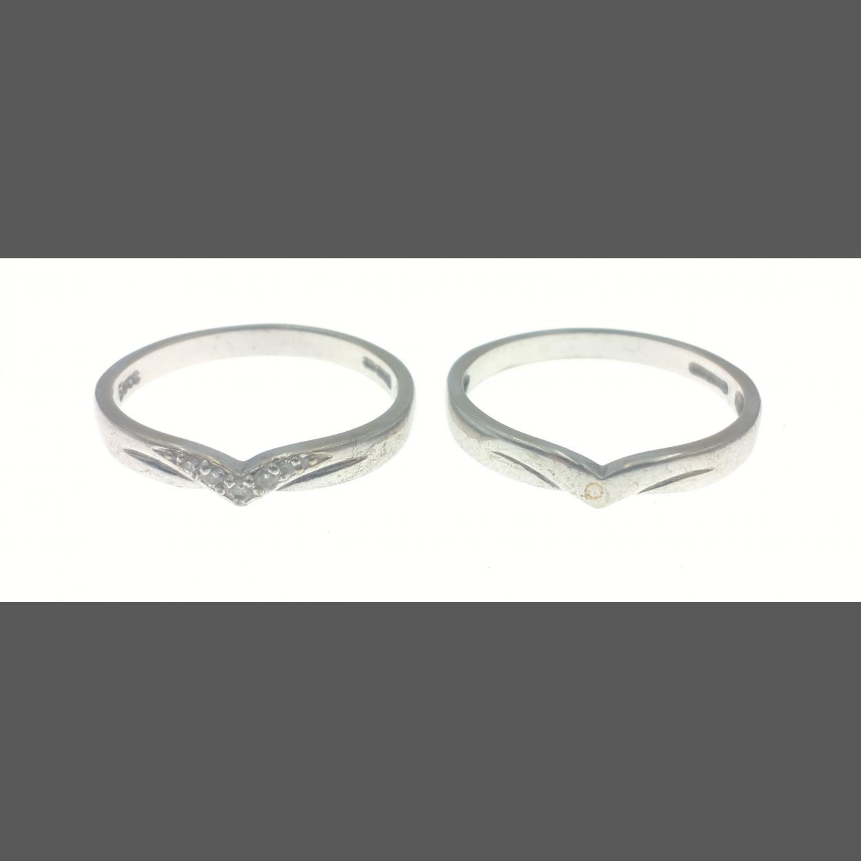 A box containing two rings. One with a wishbone style with diamond chips stamped 375 size P gross weight 2g approx. The other a similar but without chips size P, weight 2.9g approx.