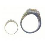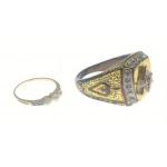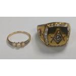 A large gaudy MASONIC symbol ring size Z and one other unmarked yellow metal ring with three seed pearls size K, weight 1.3g approx.
