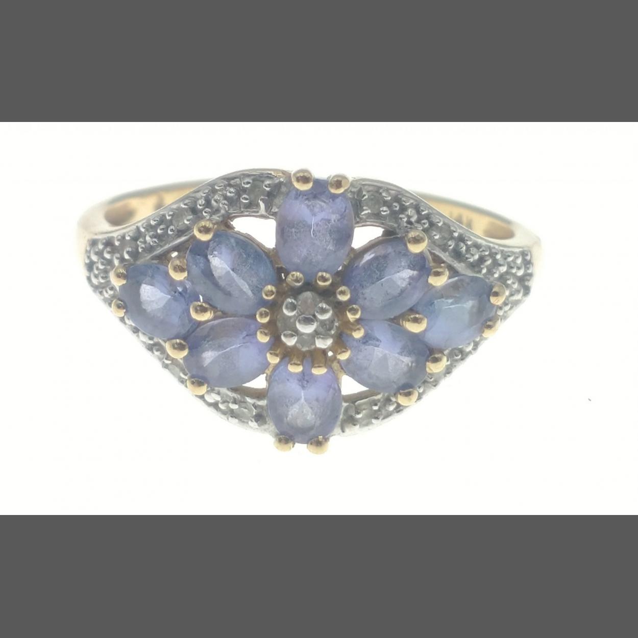 A 14K stamped 585 gold ring with a lovely cluster of eight lilac stones and diamond chips. Size Q gross weight 3.1g approx