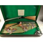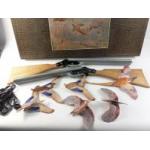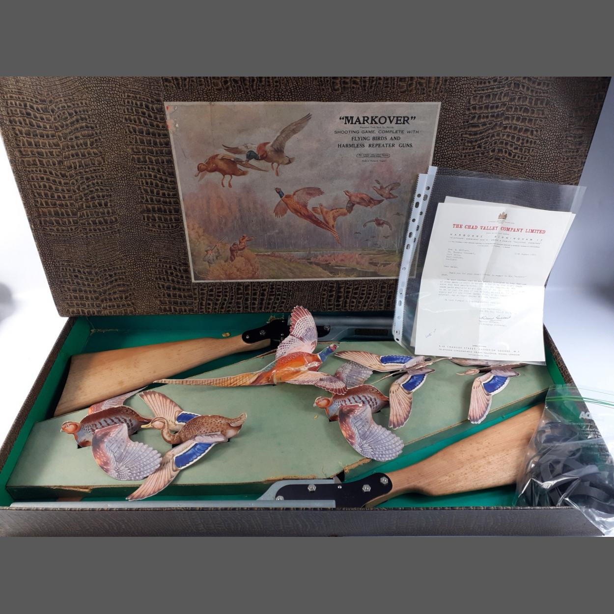 CHAD VALLEY - MARKOVER shooting game complete in box with guns, targets etc. Tested in the auction house and the bands fly off the guns and work well. The box contains letters from CHAD VALLEY in the 1960s when the vendor's mother contacted the company; they were amazed that it still survived from the 1920s. Despite an unfortunate tape repair to the Pheasant target the whole is in excellent condition, a truly remarkable survivor. Box measures 80 x 38 x 8cm approx