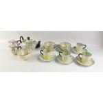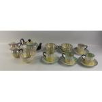 A small lustre tea/coffee set with 4 coffee cans, 1 teacup, 6 saucers, a small teapot, a small jug all in green tones plus a teacup, milk and sugar bowl with red tones