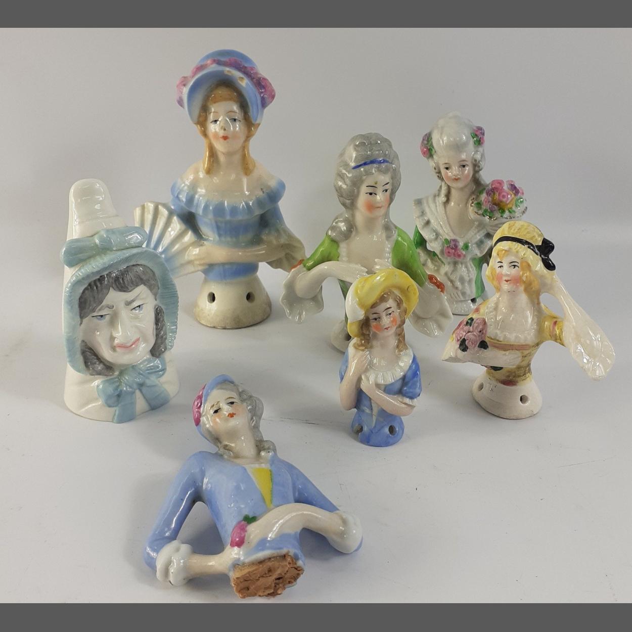 A collection of six 1920s pin cushion half dolls in various sizes, the tallest being 10cm high (with a couple of tiny chips) and also a ROYAL WORCESTER Mrs Caudle (7cm high)