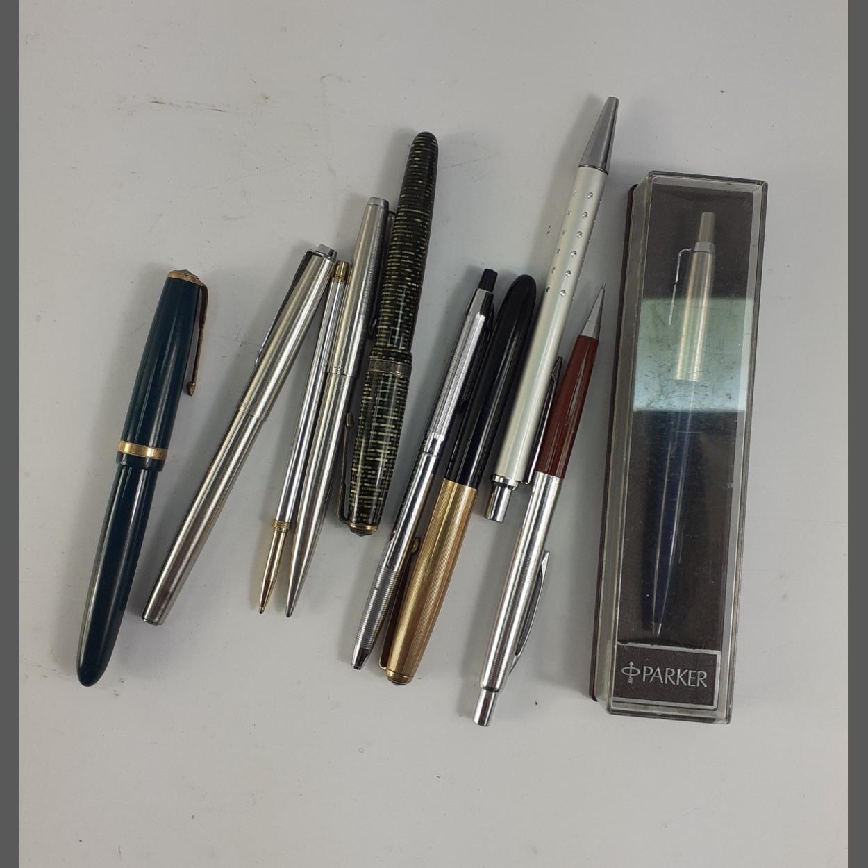 Vintage pen collection comprising green PARKER DUOFOLD, PARKER VACUMATIC with green striped barrel, gilt top ONOTO and others.