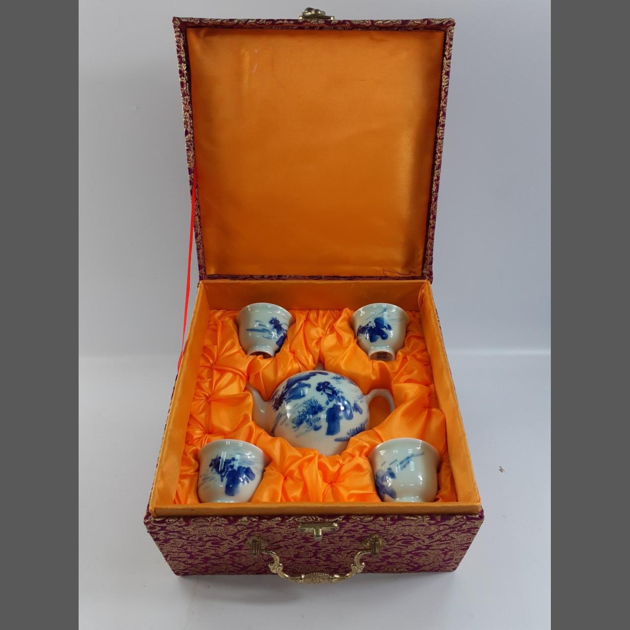 A well-presented Chinese tea service comprising teapot and 4 cups all set within a silk and gold fabric covered box 23x23x13cm
