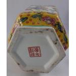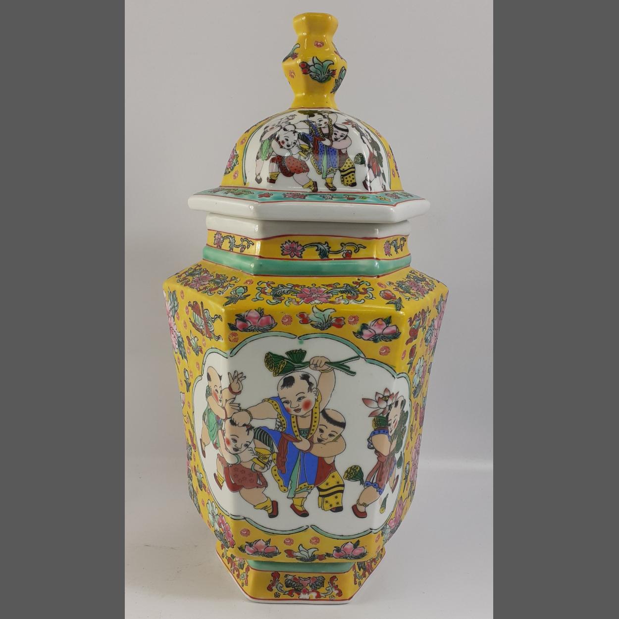 A famille jaune inspired lidded vase heavily decorated with playing children and flowers galore. Stands approx 35cm high. Tiny chip missing from lid.