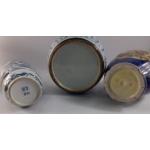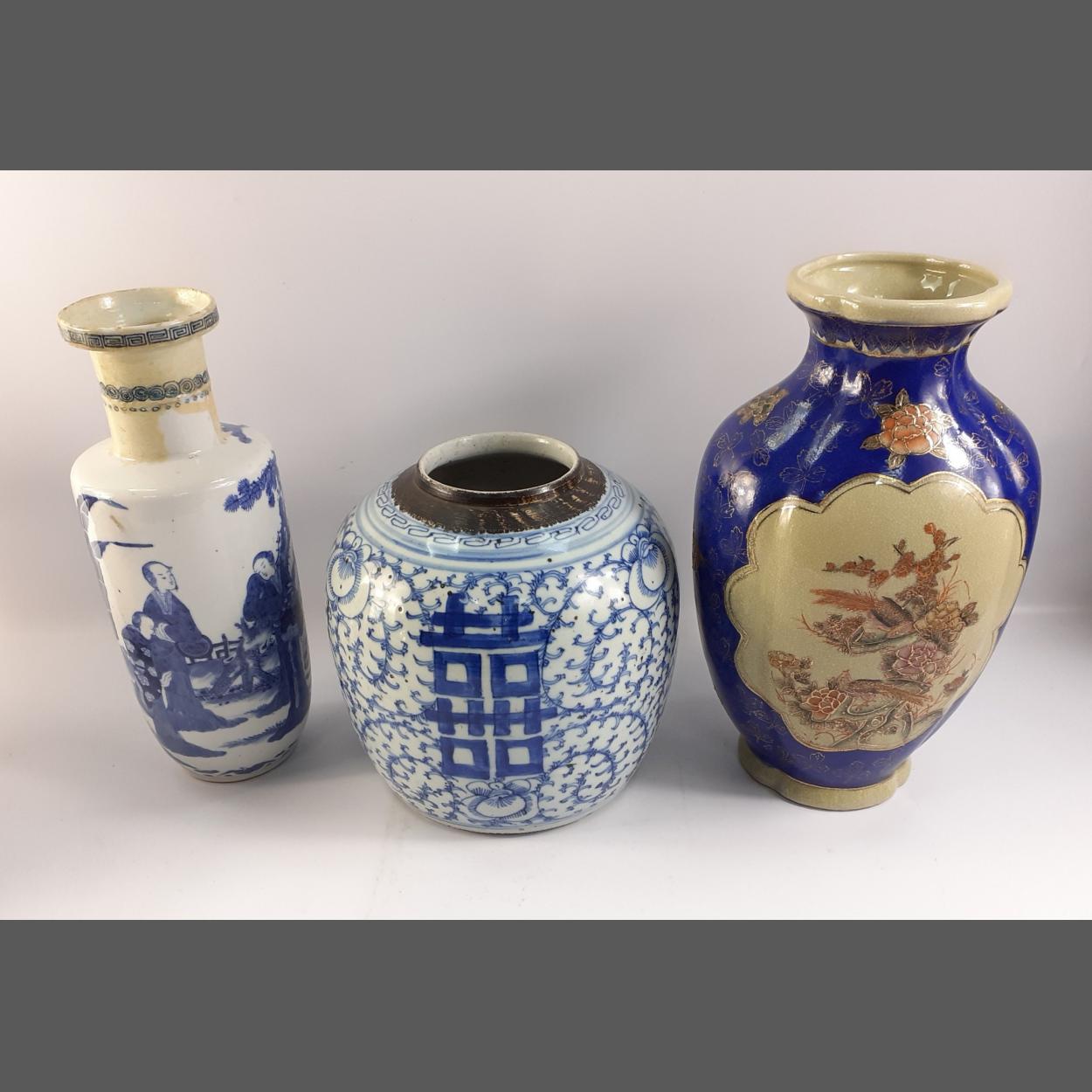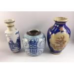 Three Oriental vases the tallest being crackleware with cobalt blue base and gold highlights (30cm high), a nice round blue and white vase 22cm high and another blue and white vase with multiple figures 30cm high