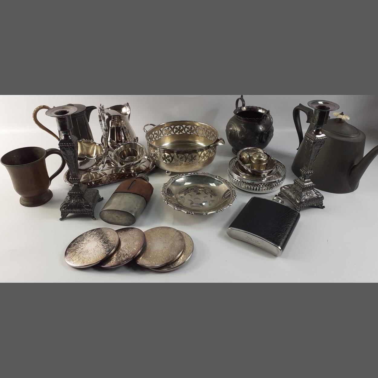 A great lot of PLATED SILVER EPNS items to include candlesticks, various trays, hip flasks, condiments etc. A nice substantial lot.
