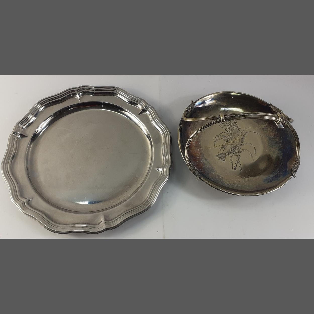 An EPNS silver plated salver 33cm approx and a lovely silver plated handled basket with inscribed bird pattern.