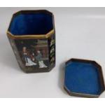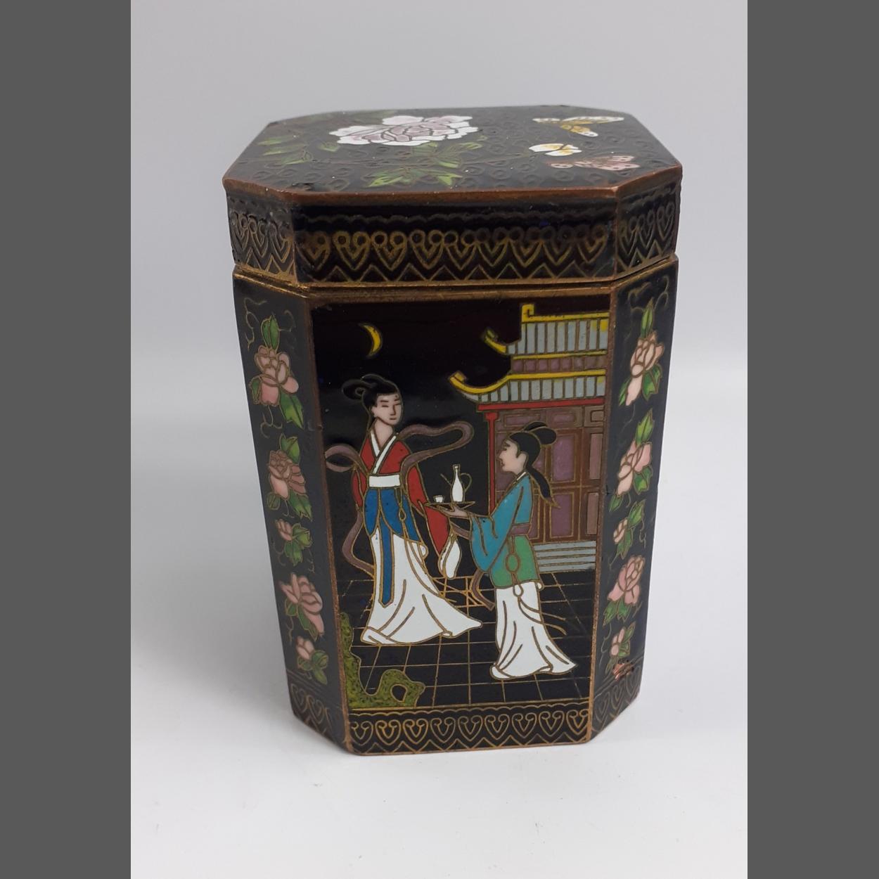 A quality cloisonne box with ladies in kimonos, floral highlights and a lovely blue inner (9cm high approx),