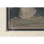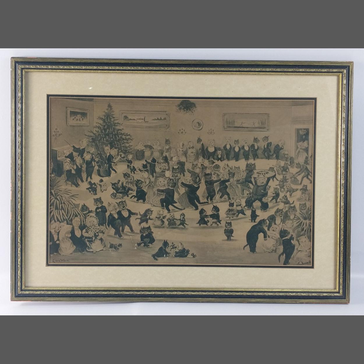 LOUIS WAIN. A lovely older Louis Wain print in older frame. Humorous and good fun, Cat ball in full swing, frame size 65 x 47cm approx