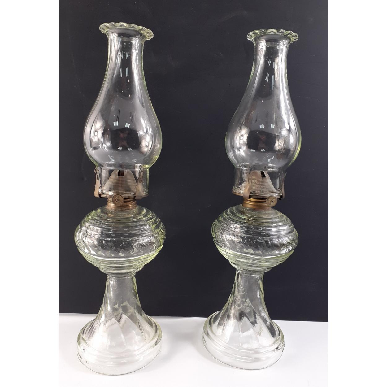A lovely pair of clear glass Portuguese oil lamps with chimneys. Each stands 41cm tall. Both in nice clean undamaged condition.
