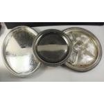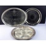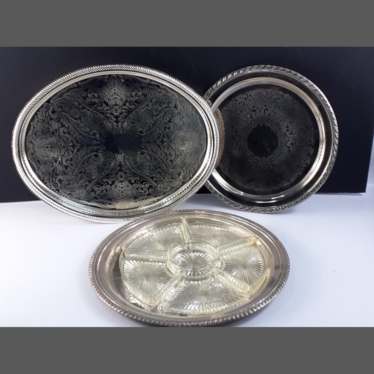 Three pieces of silver plate to include a tray 37cm dia with 6 glass hors d'oeuvres segments, an oval tray 42cm with pierced gallery and a round tray 31cm