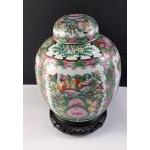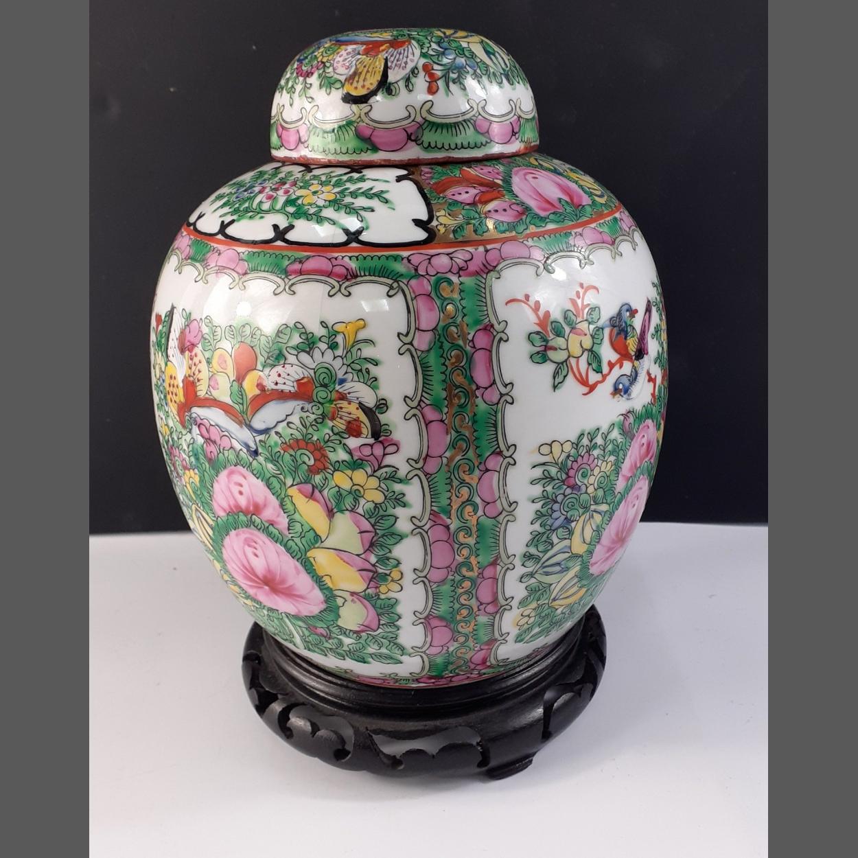 A lovely Oriental GINGER JAR on wooden plinth with well-executed floral and bird decoration. 24cm tall approx and in excellent condition.