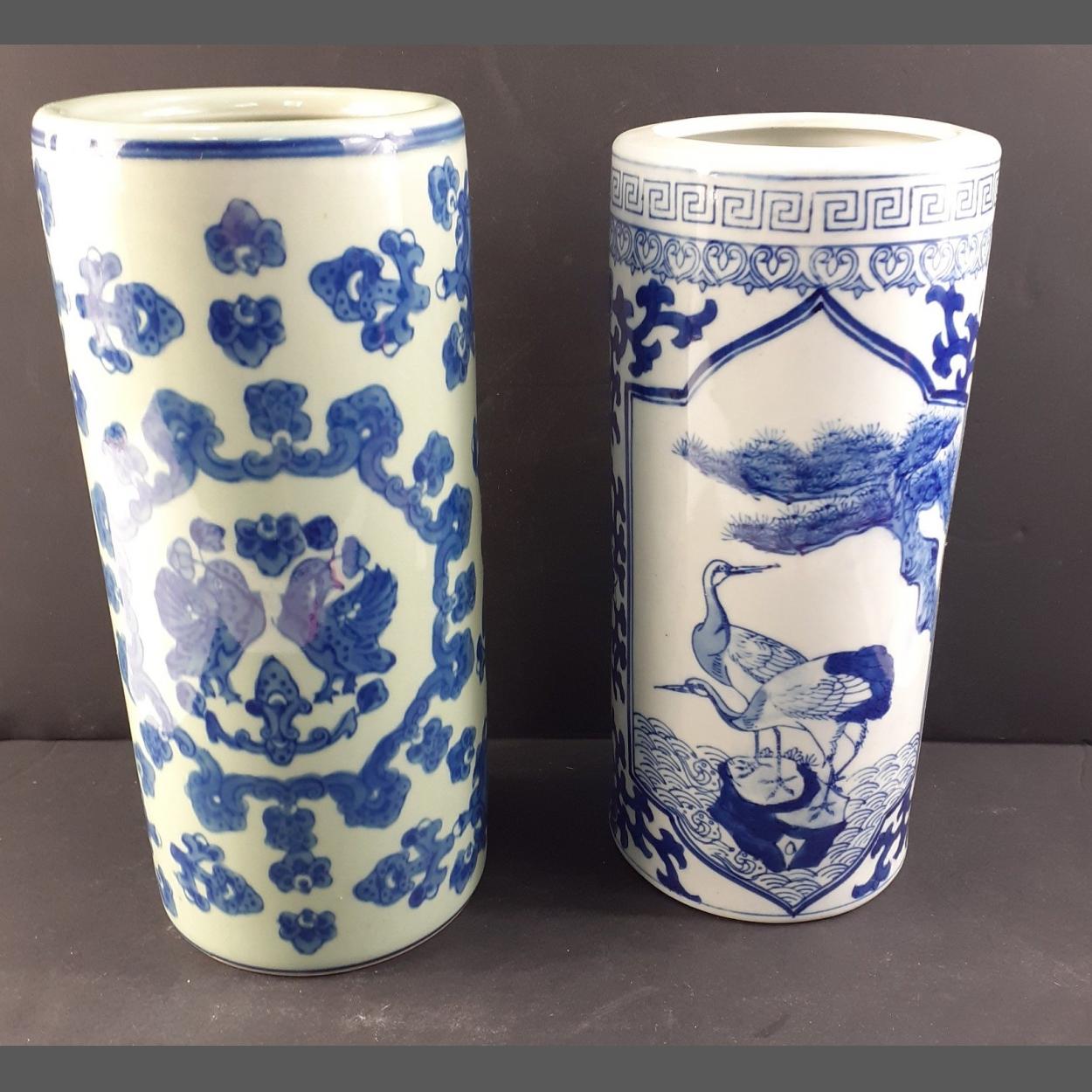 Two blue and white straight sided vases, each 29cm high approx and 13cm dia. One is decorated with cranes and the other with doves and floral motifs. No damage