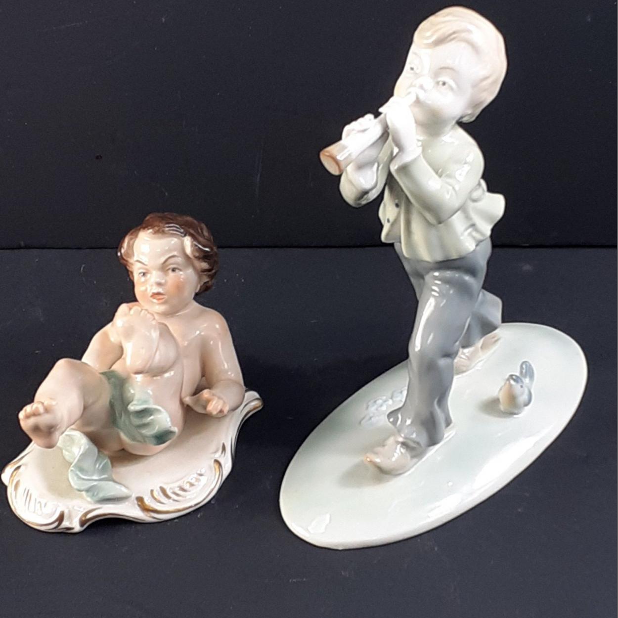 Two small ceramic figures being a lounging baby approx 10cm long and the other a boy playing a horn with a bird beside him made by East German KUNST porcelain standing 16cm high and 14cm long