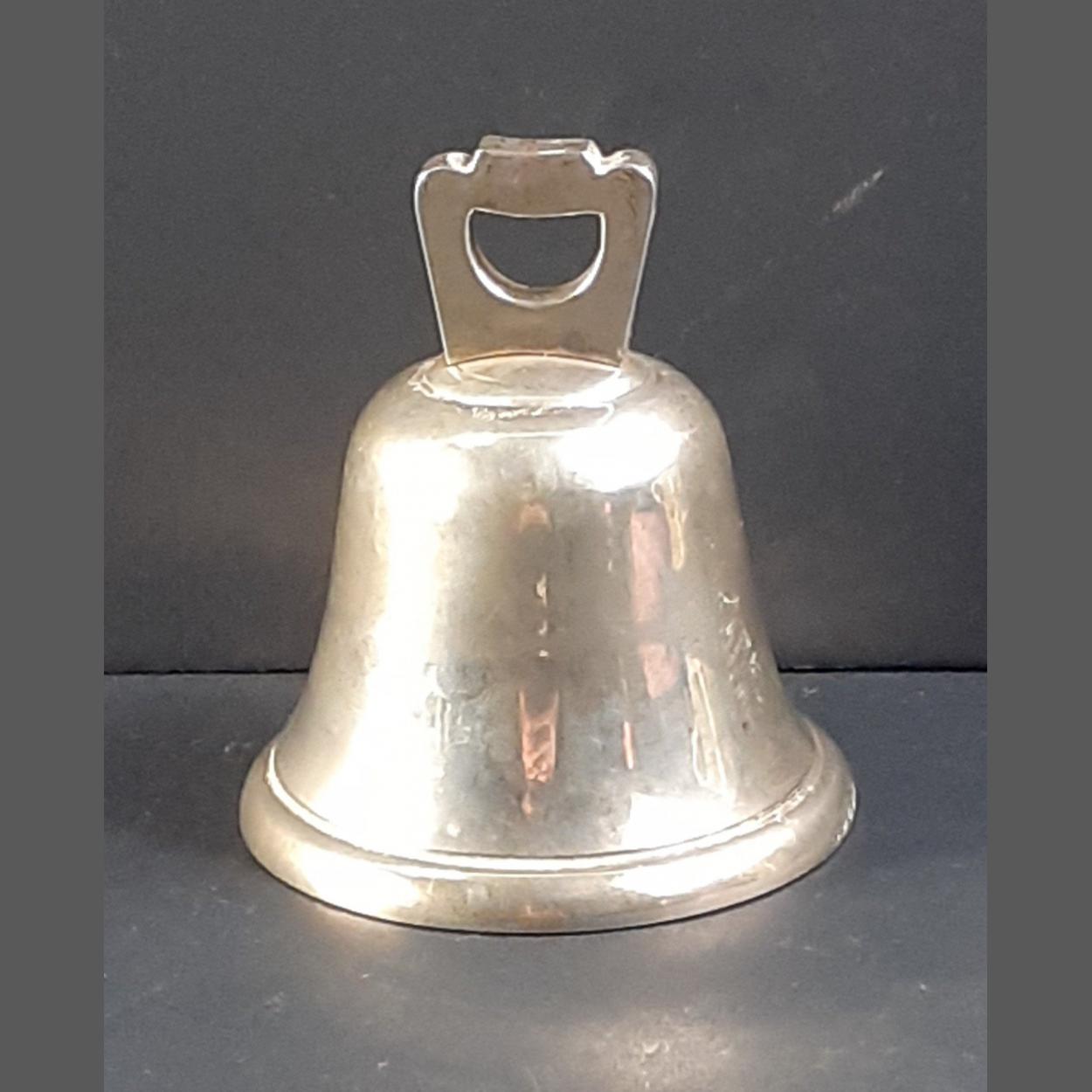 AN ANTIQUE STERLING SILVER bell with hallmarks on body, handle and clapper for Birmingham 1927. Stands 8cm tall and weighs 160g approx. Maker DF