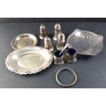 A lovely little collection of silver plated small dishes and condiment pieces including two Walker and Hall pots with Bristol Blue glass liners and matching spoons.