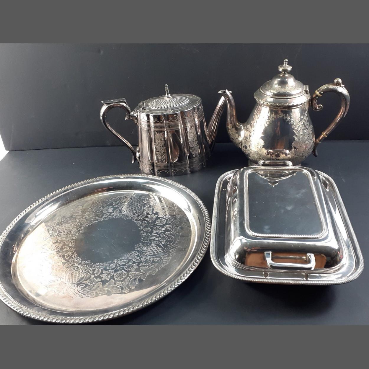 A mixed lot of quality silver plated items to include a 31cm approx plated salver, a teapot by Gibson of Belfast and others. A great lot of quality pieces.