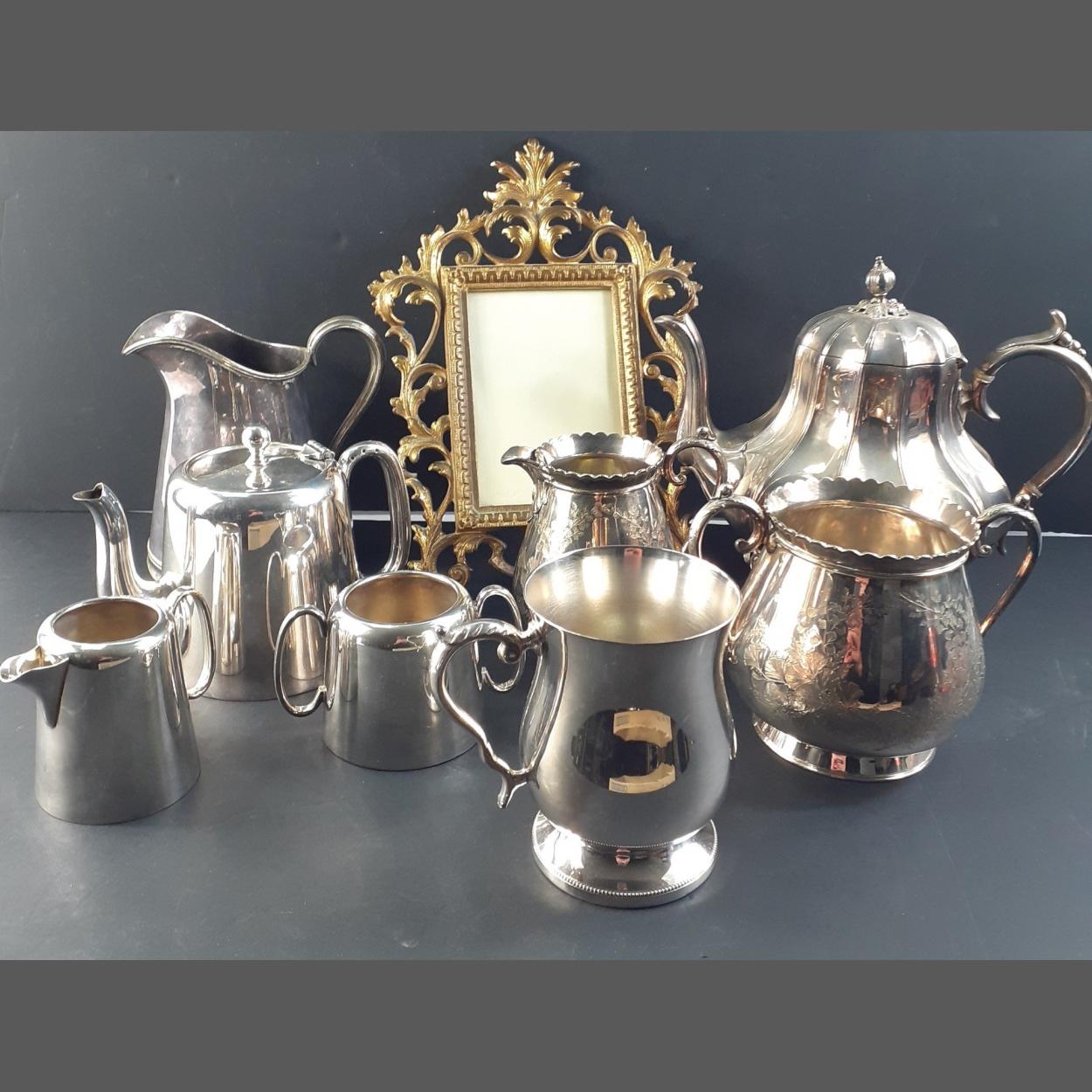 A quantity of super silver plated items to include an Elkington jug, a teapot by Philip Ashberry and much else. Also a rather nice brass picture frame.