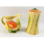 A rare CARLTON WARE Australian Design embossed Anemone sifter / caster / sugar shaker in lovely bright colours to include a similar cream jug stamped 'foreign'.