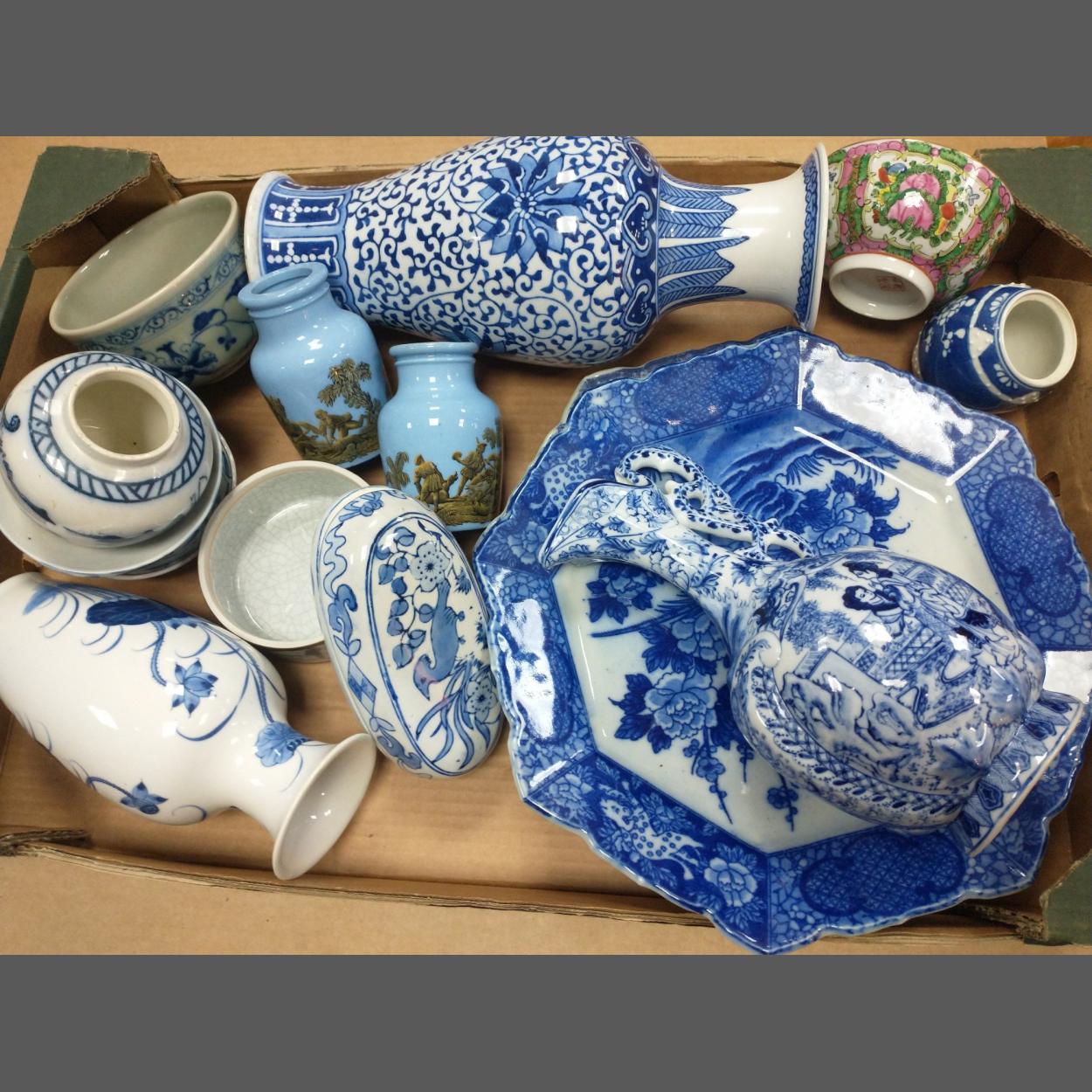 A box of blue and white ceramics to include a lovely Oriental urn 23cm high, a vase 31cm high, 2 octagonal plates 30cm dia. an attractive hand-painted Imari plate and much more