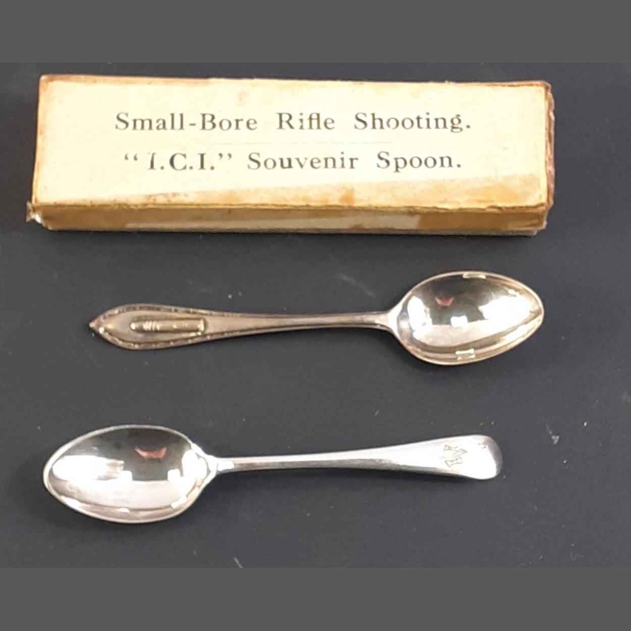 A boxed SMALL BORE RIFLE sterling silver hallmarked teaspoon ICI 12g approx and another similar plated spoon.
