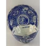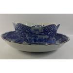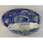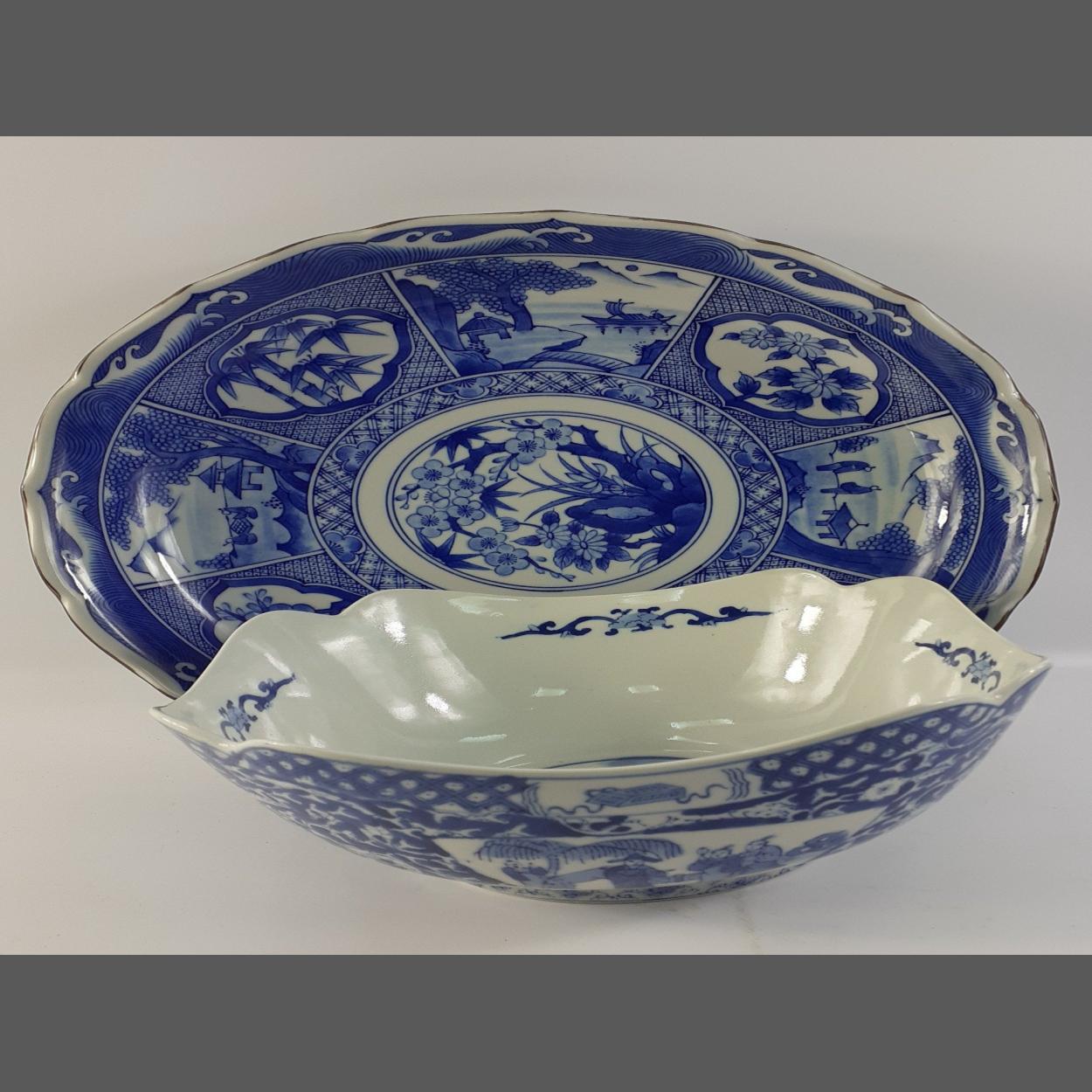 A super large blue and white Oriental charger 36cm diameter with fluted edges plus a blue and white square shaped bowl with Oriental figures in centre 24x24x10cm