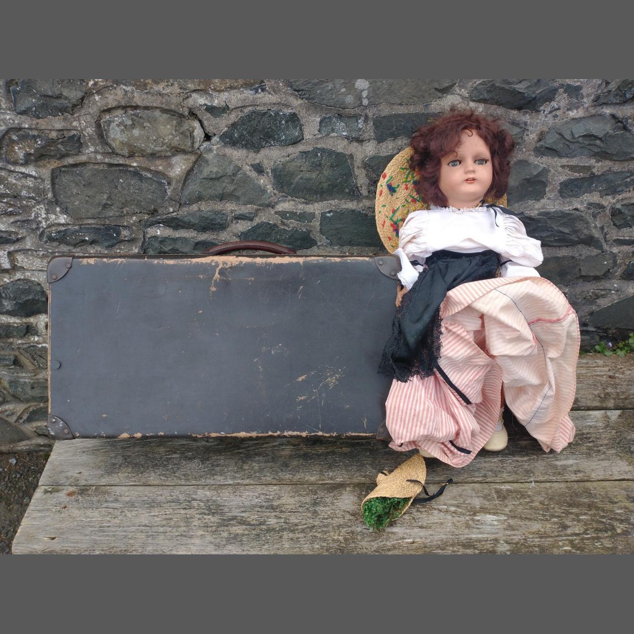 A vintage black cardboard suitcase 53x29x16cm. Comes with contents of a large VINTAGE articulated doll approx 60cm high dressed in traditional fisherwoman costume