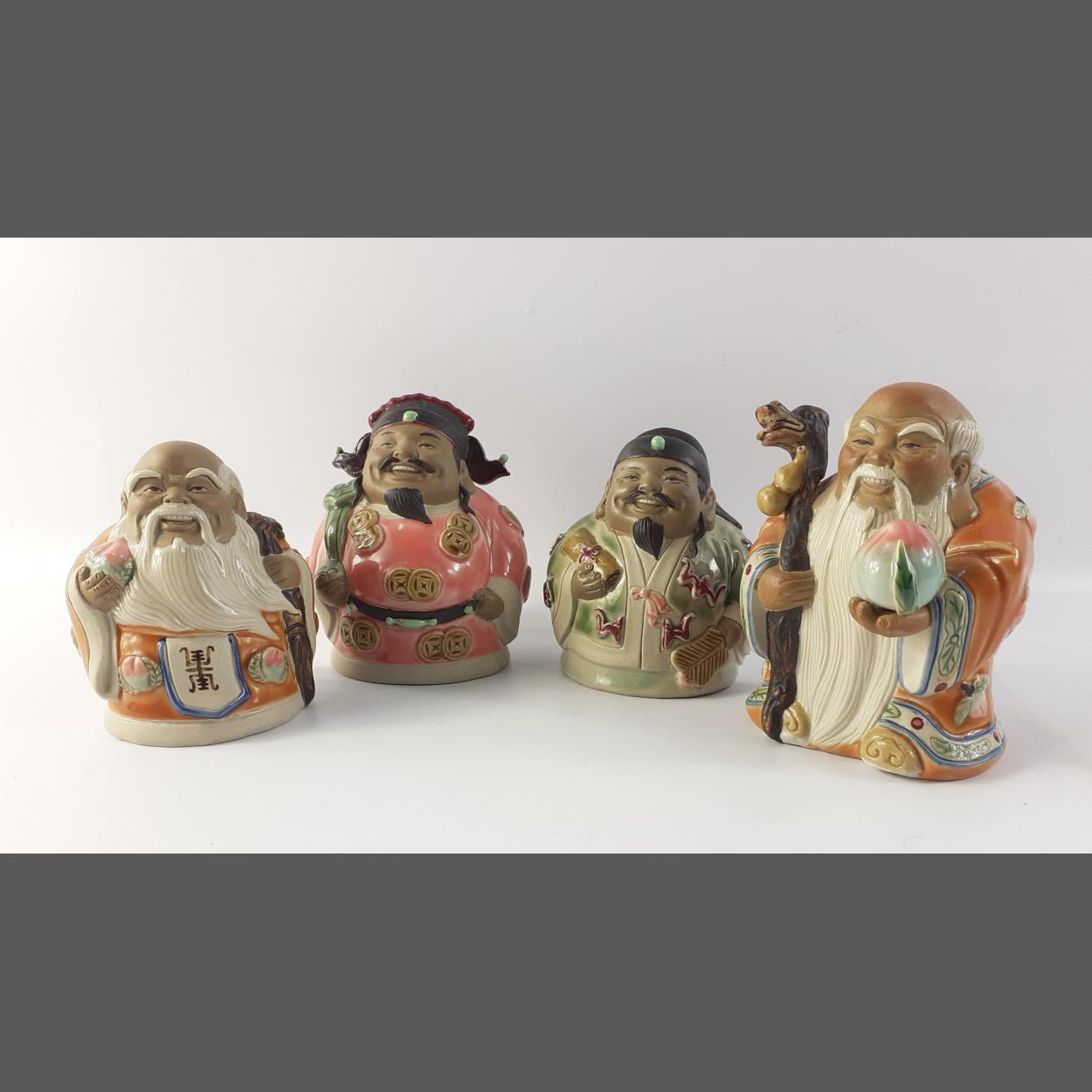 Four happy, chubby Oriental gents including 2 holding lotus flowers each with impressed maker's marks