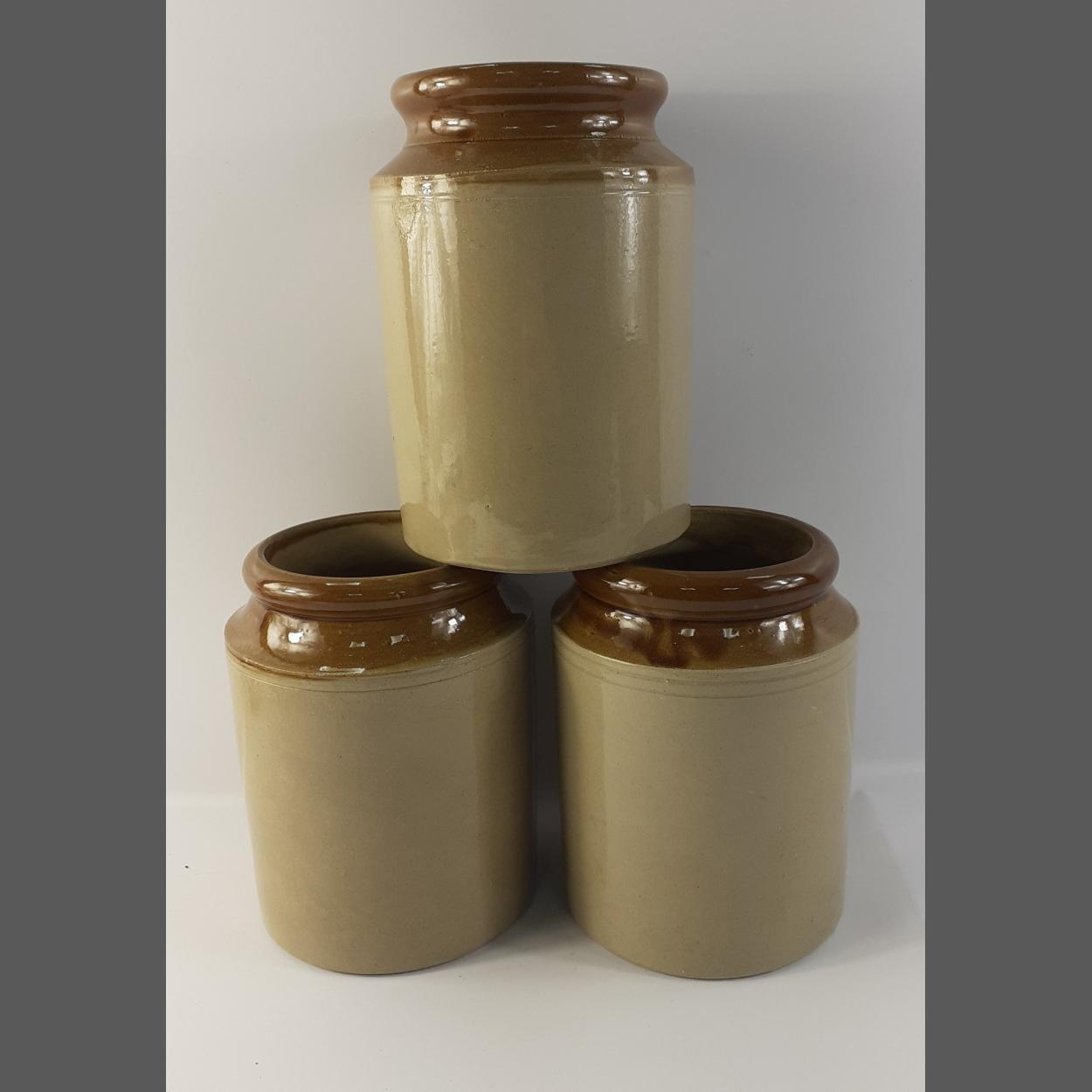 Three lovely stoneware store jars in excellent condition. Each stands 20cm approx.