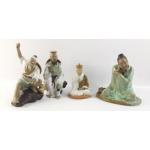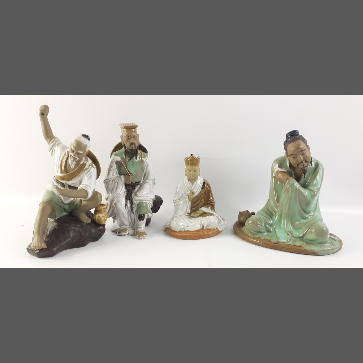 Four Chinese MUDMEN 3 of whom are approx 18cm high with one smaller at 13cm (slightly damaged). One large piece of man with flywhisk has a small chip missing