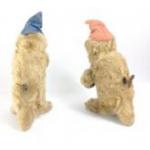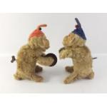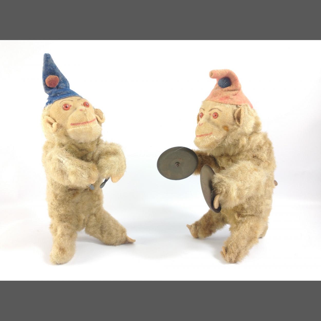 A pair of mid-century clockwork MONKEYS. One with cymbals but the other is missing his drum. Both motors work and go into action with a gentle wind. Each stands approx 19cm tall.