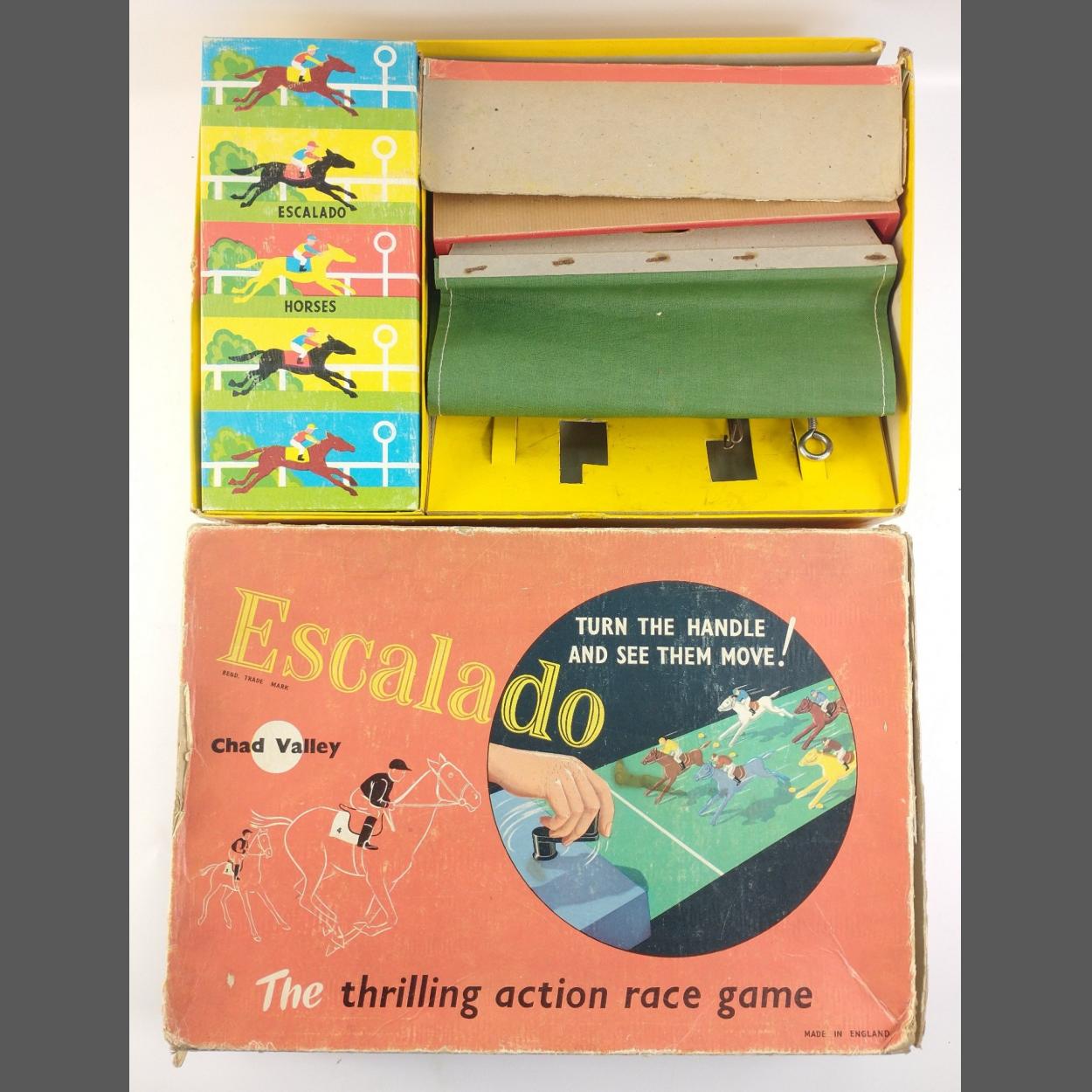 An older CHAD VALLEY ESCALADO Horse Racing Game boxed with five lead horses. Box with wear and flap damage but a great set.