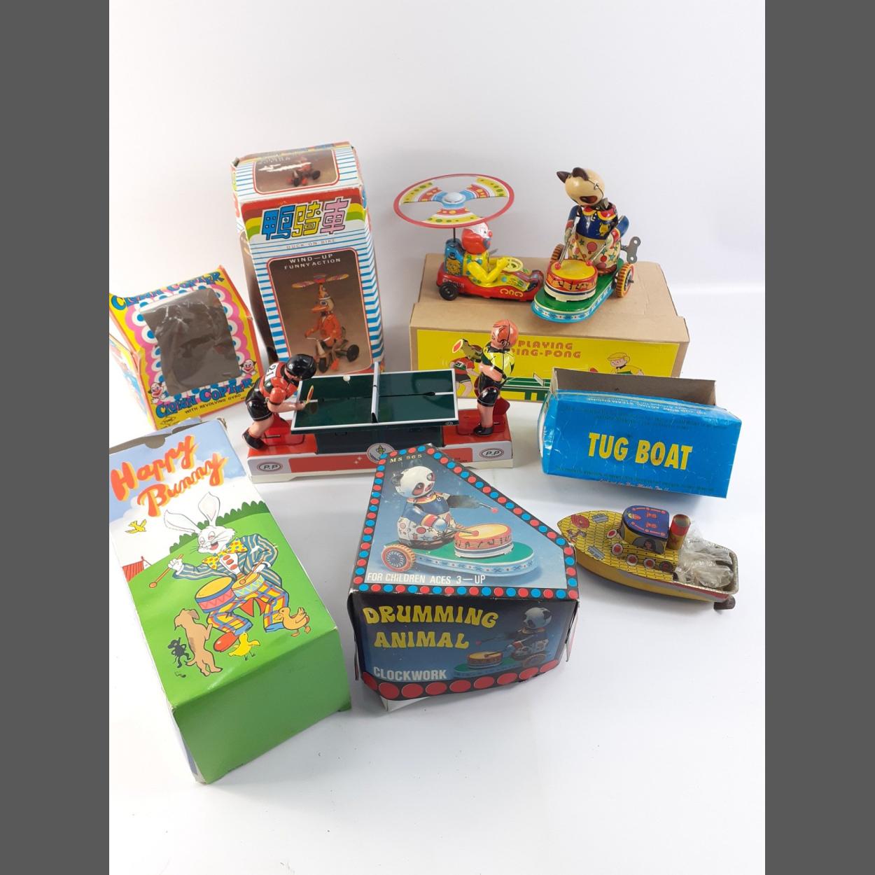 Clockwork toy fun ! A Yone Clown Copter no 2139 in damaged box, modern boxed drumming Panda Bear and another. A Duck on a Bike, a drumming Bunny, a tin plate Tug Boat and a Ping Pong set.