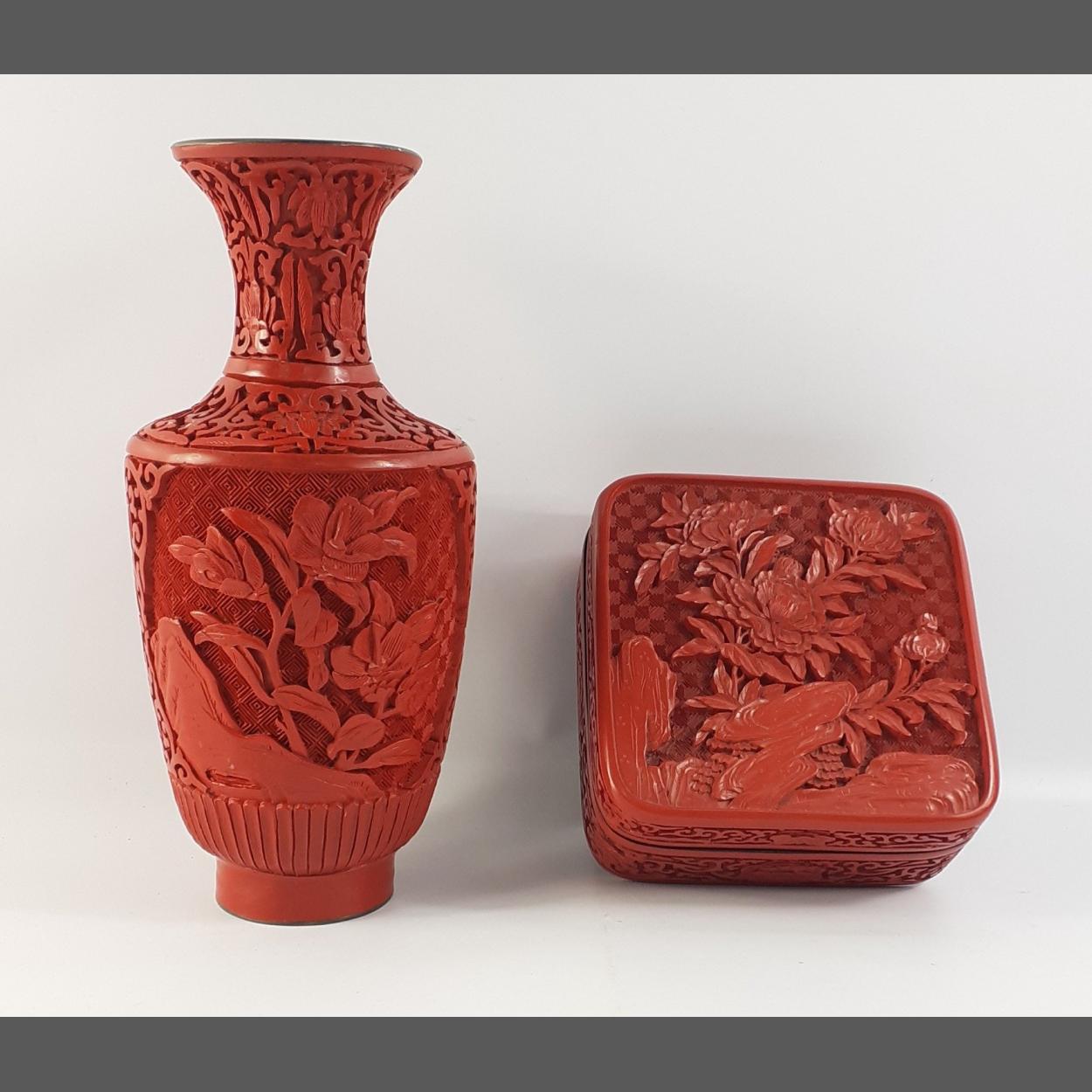 An Oriental red carved vase with blue enamel lining (small chip in rim but hard to see) standing 23cm high and a red carved box (13x13x5cm approx)