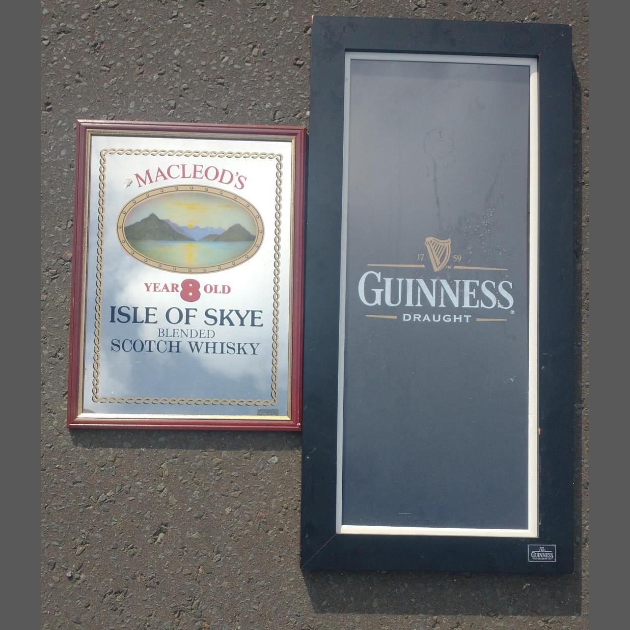 A large GUINNESS DRAUGHT framed wall print 100 x 48 cm approx and an ISLE of SKYE Whisky advertising mirror 56 x 42cm approx. Both need a light clean.