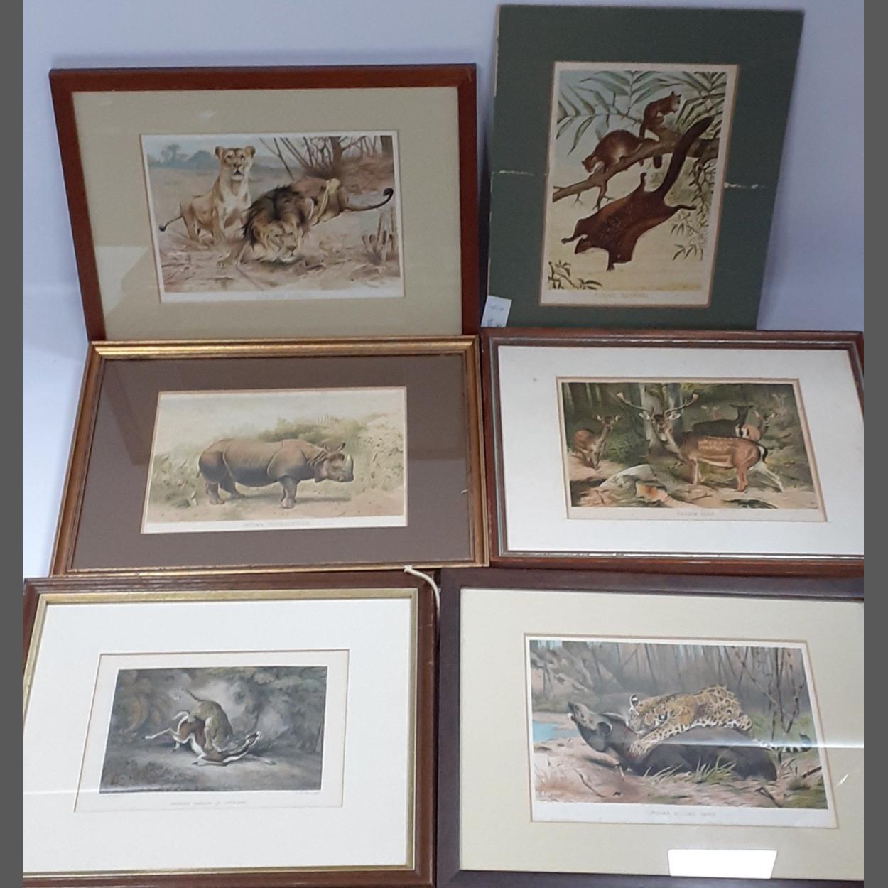 Six prints of animals, 5 framed (33x25cm approx) and 1 unframed to include a deer, lion & lioness by W KUHNERT, Indian rhinoceros by RJ SMITH, leopard seizing an antelope by E HACKER, Jaguar killing tapir by WKUHNERT