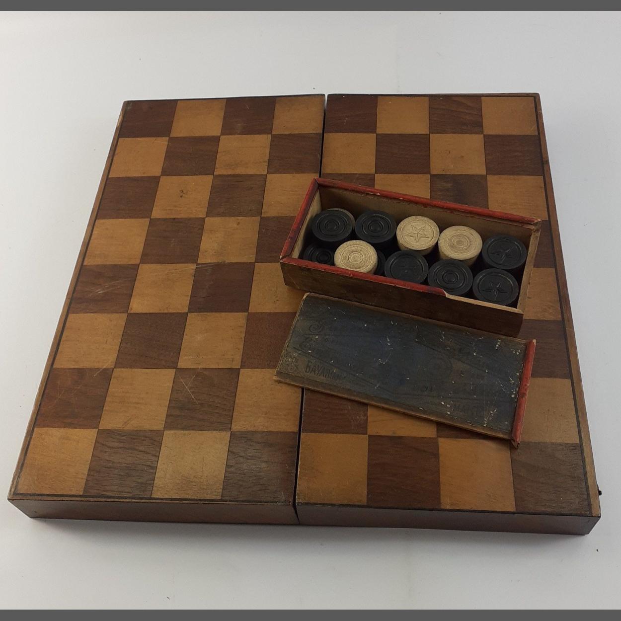 A SUBSTANTIAL wooden hinged games box marked for chess on the outside and backgammon inside 36x18x7cm approx. Also a vintage wooden box of Bavarian draught pieces