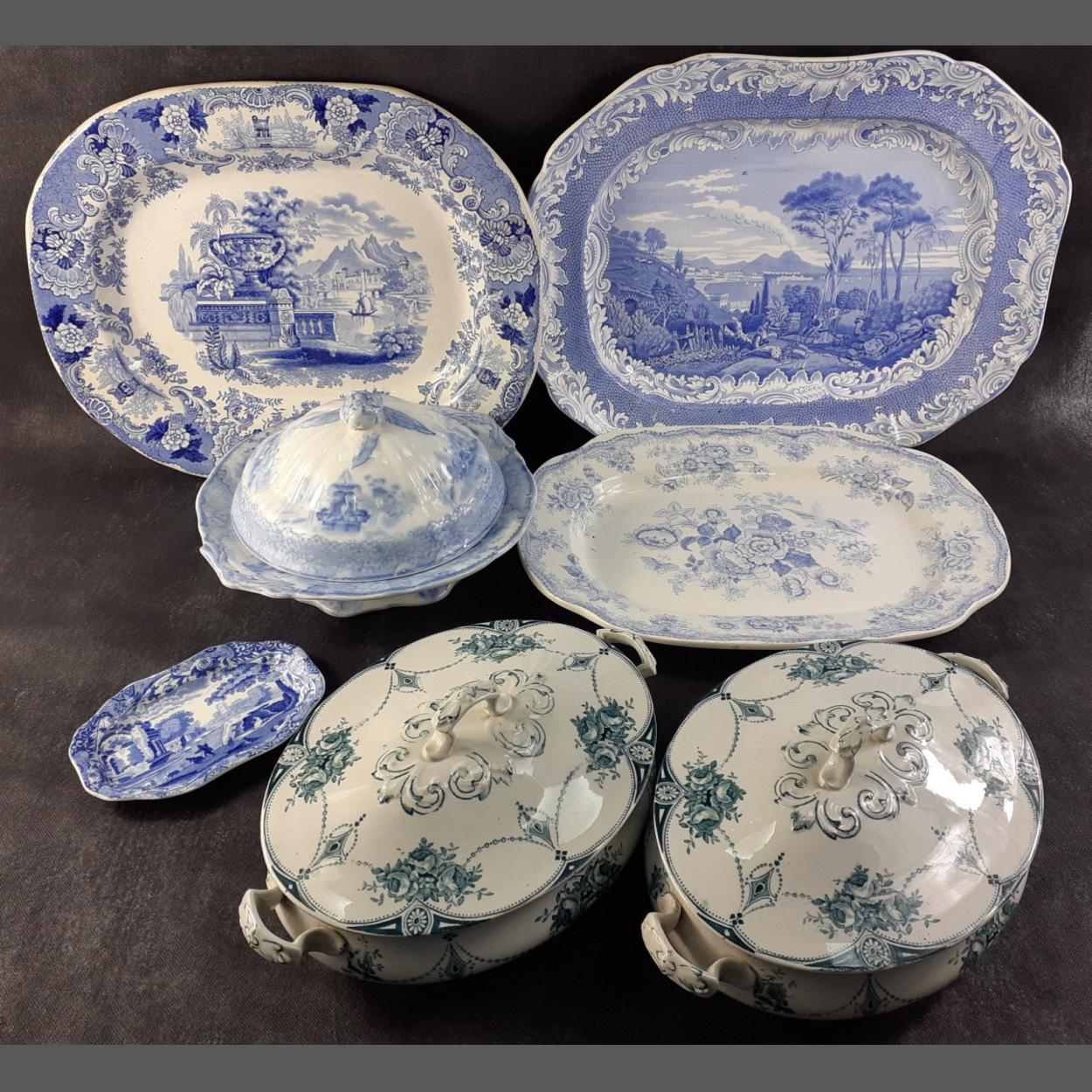 A box of nice older blue and white ceramics to also include an attractive pair of green and white tureens. A super lot in good condition.