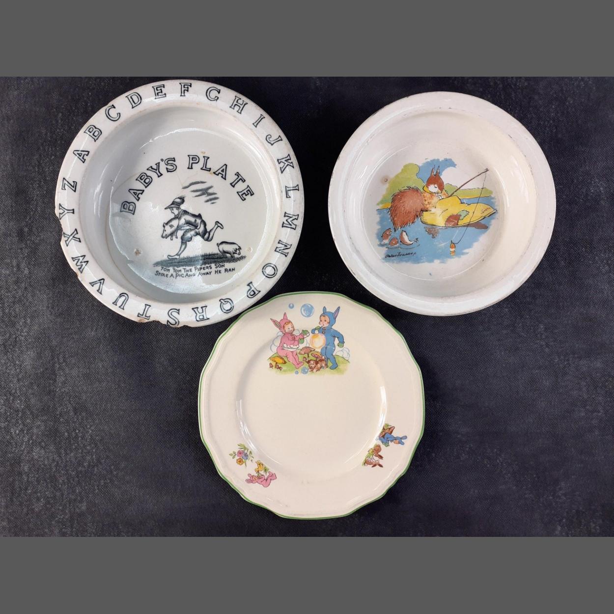 A small lot of antique children's plates to include a James Kent Animal Frolics Peter Fraser signed bowl with a scene of a cute squirrel fishing in good order and two others A/F. A lovely old sentimental lot.