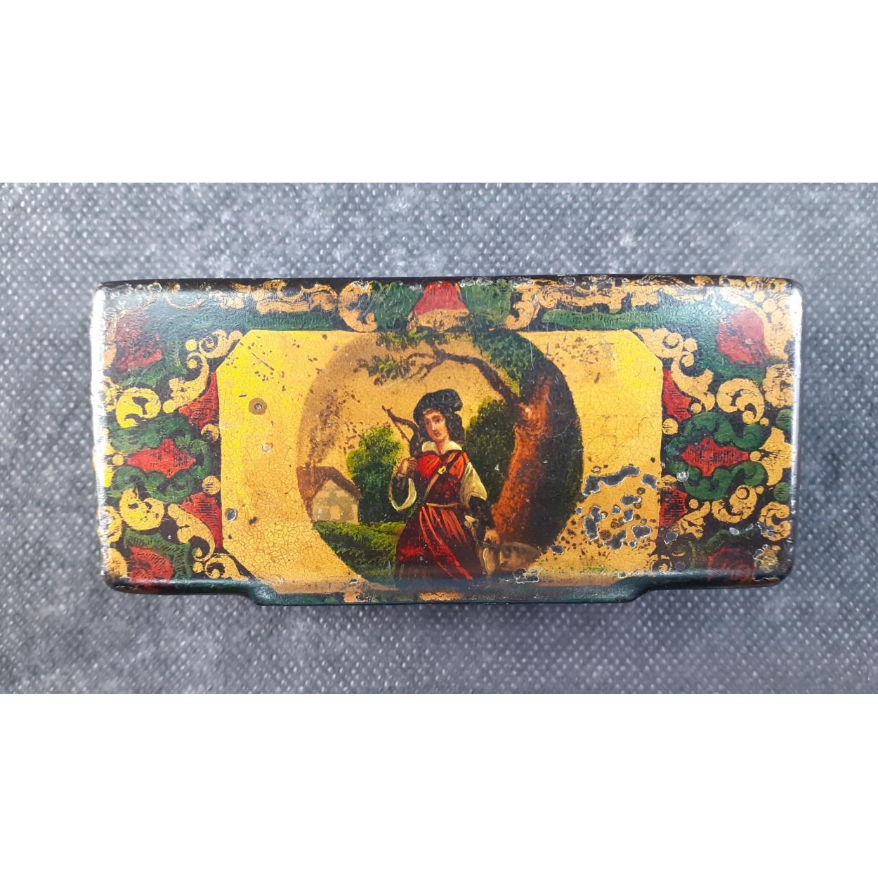 A super little antique papier mache box 9cm approx and in lovely condition with a nice painted scene