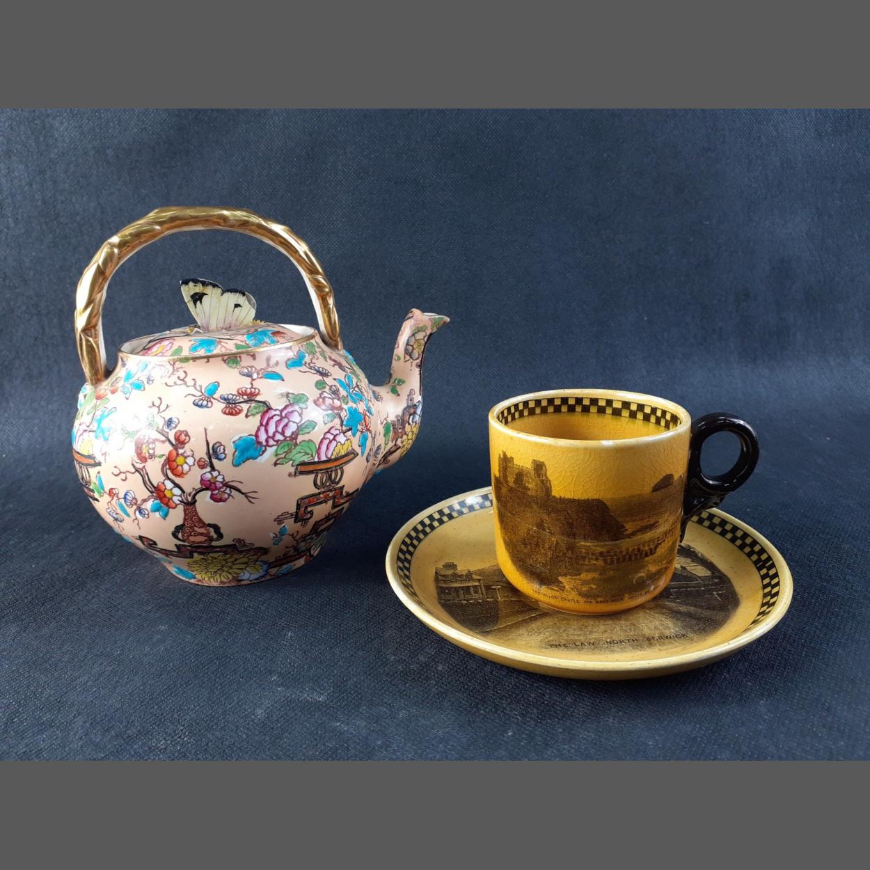 Ridgways cup and saucer with NORTH BERWICK scenes applied of Berwick Law, Tantallon Castle and the Bass Rock. Stands 7cm approx. Lot includes an Oriental gilt handled tea pot with butterfly handle Damage to Butterfly wings but displays beautifully. Victorian registration Lozenge mark to base.