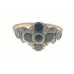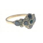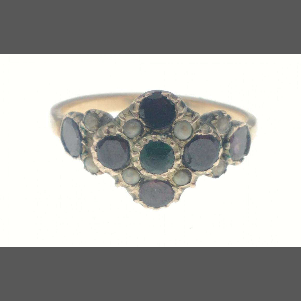 An unmarked ‘yellow metal' vintage jet/set ring in floral form with a green set centred stone surrounded with seed pearls / gross weight 2.95g approx - ring size O