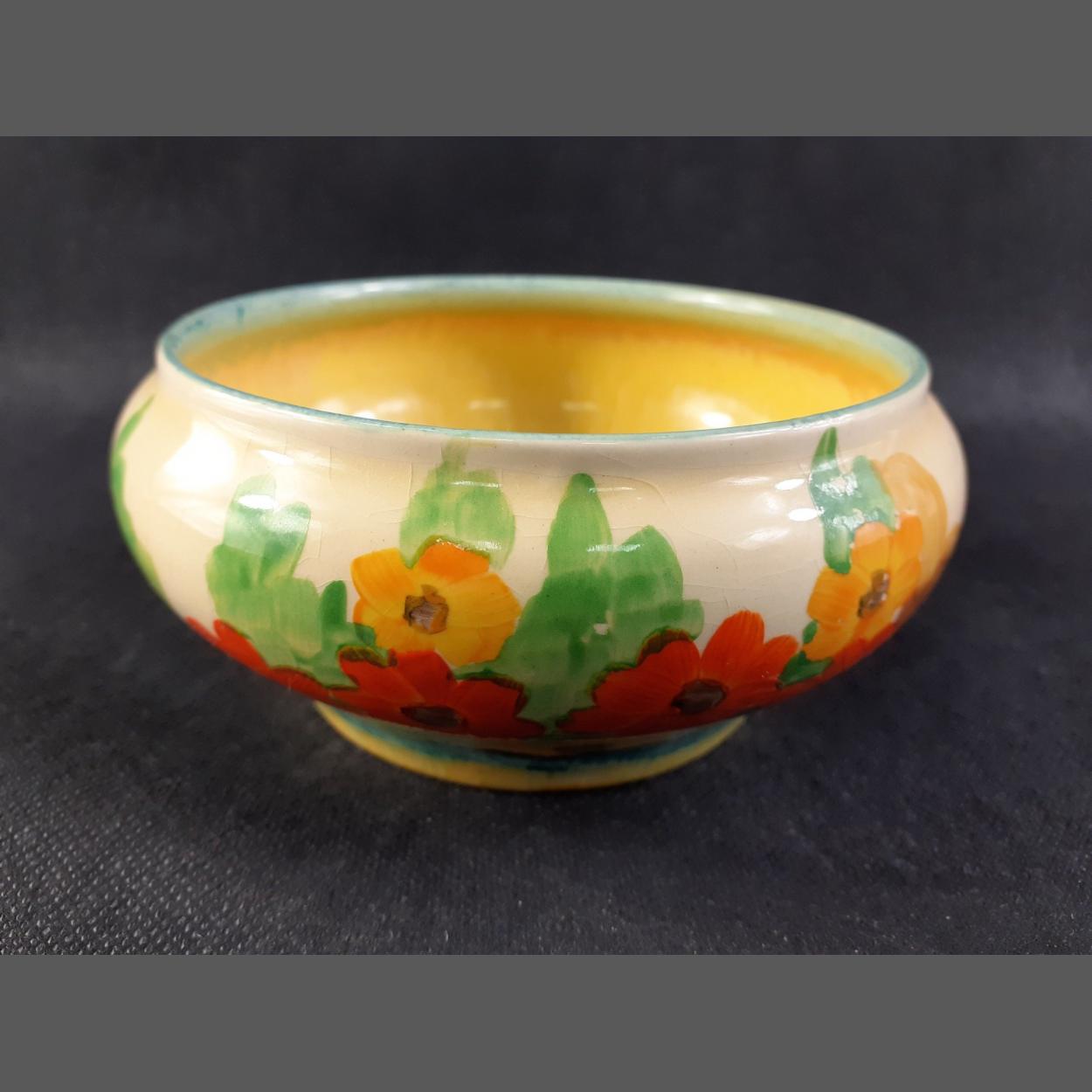 A small CLARICE CLIFF bowl in the BIZARRE pattern hand-painted with nasturtium like flowers, 12cm diameter 6cm high