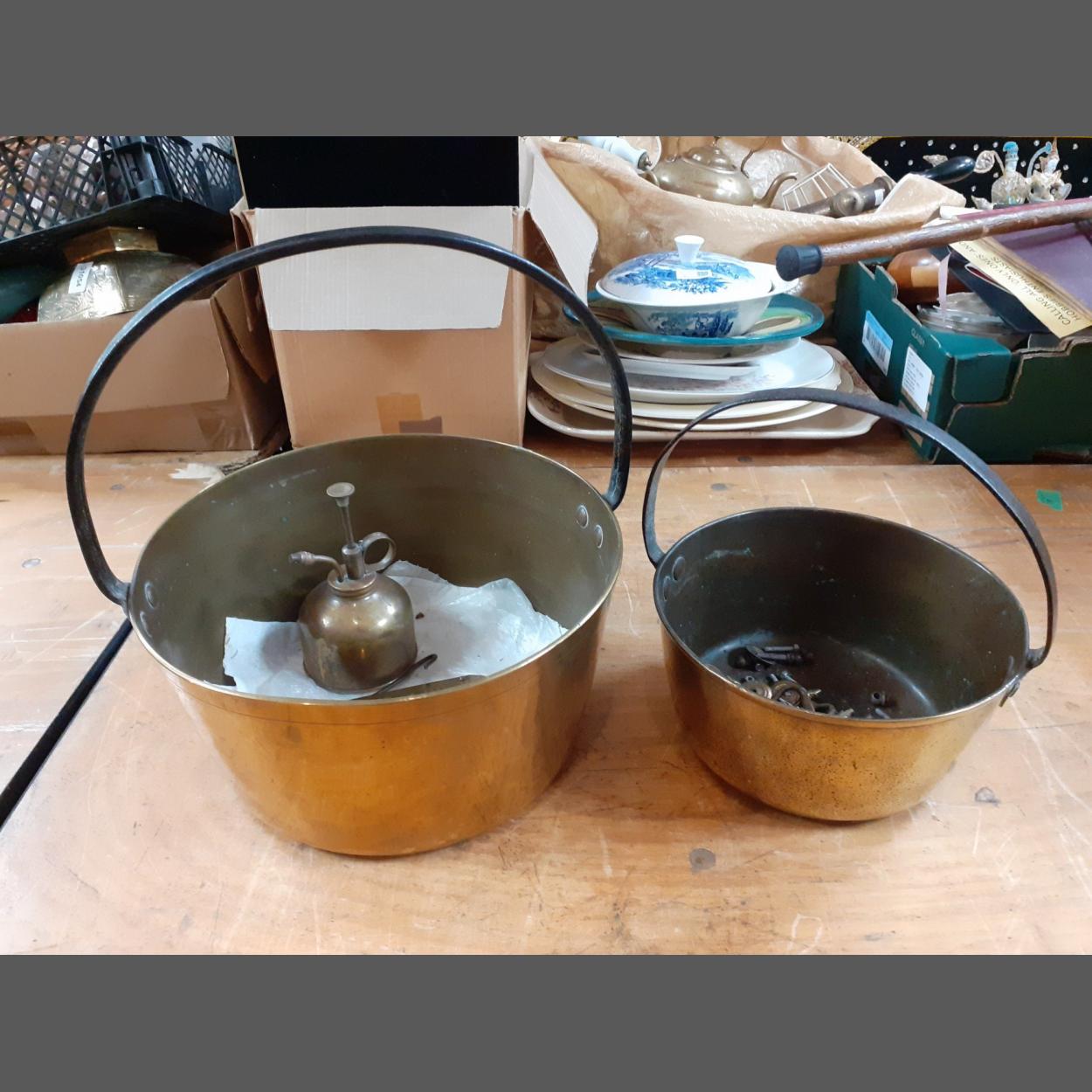Two HEAVY BRASS jeely pans / Jam pans with wrought rivetted handles the larger being 30cm across the smaller 22cm. Heavy and substantial. Also includes an old oil can, Salters scales and a quantity of old brass furniture handles.