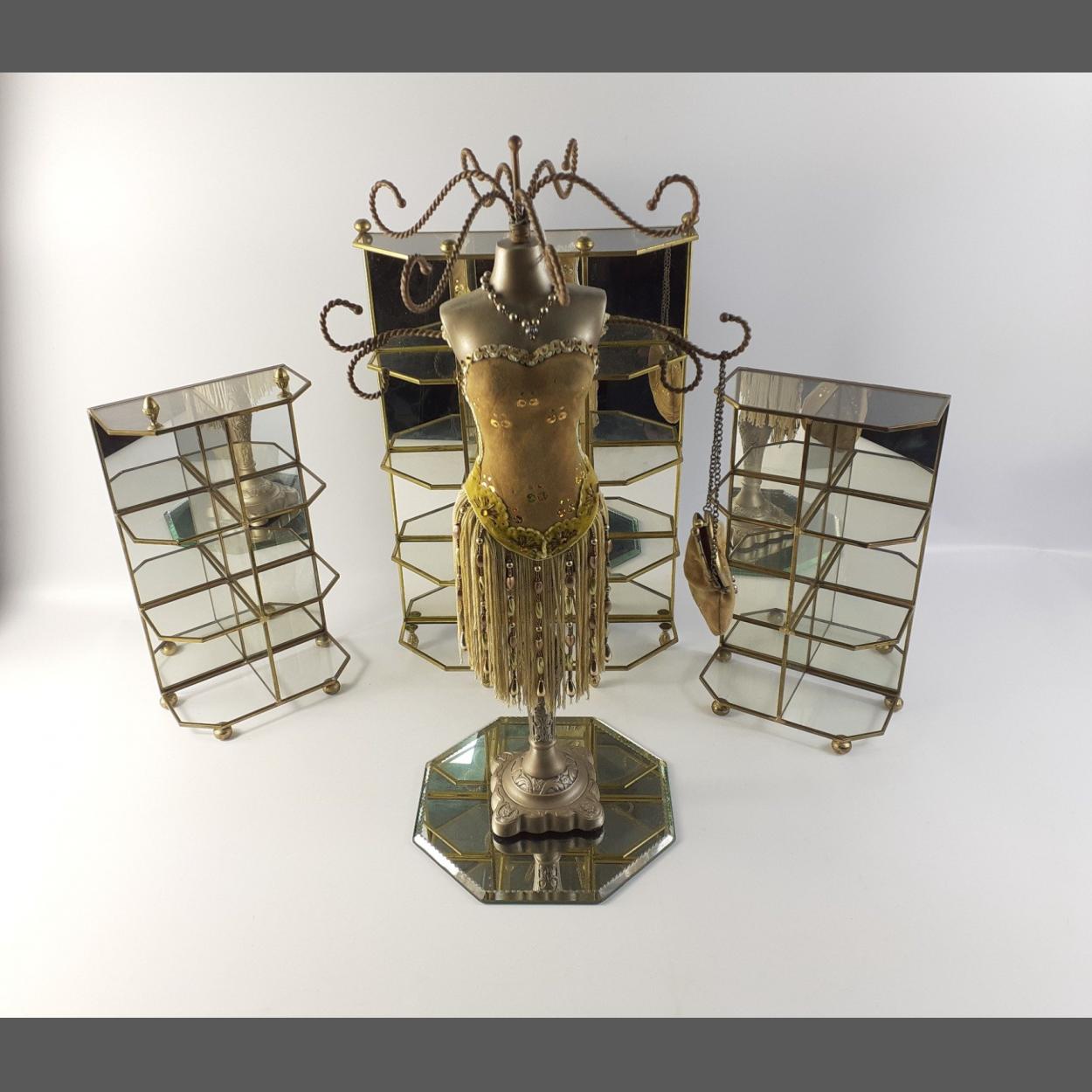 Three mirrored jewellery display stands, the largest 42cm high, the smaller 2 29cm with small octagonal mirror and a rather elaborate mannequin style dressing table display standing 48cm approx