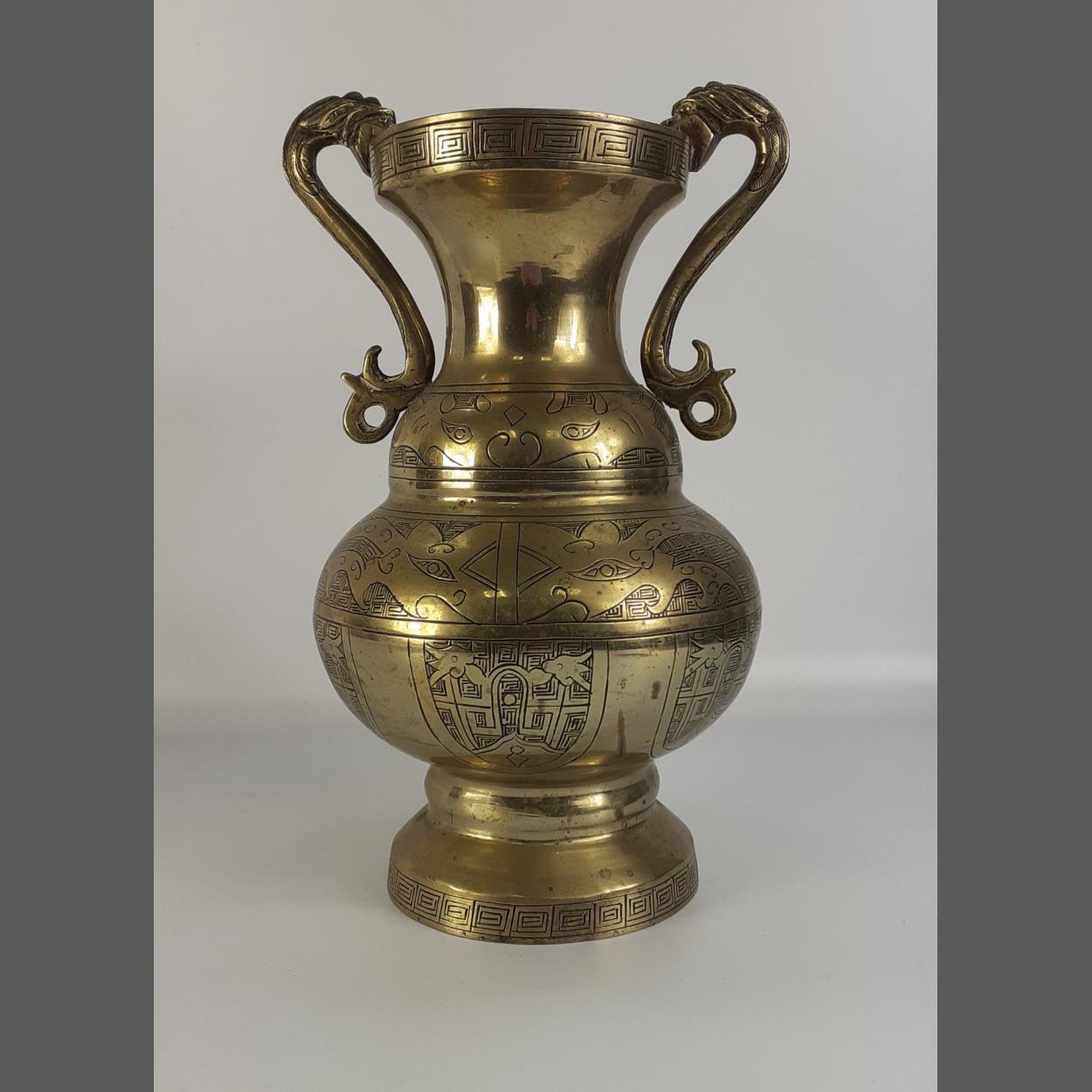 A heavy brass urn shaped vase with dragon handles. Early piece with signed base and Made in China stamp. Believed 1920-1930s. There is a crack and seperation in one handle and a split in the waist.