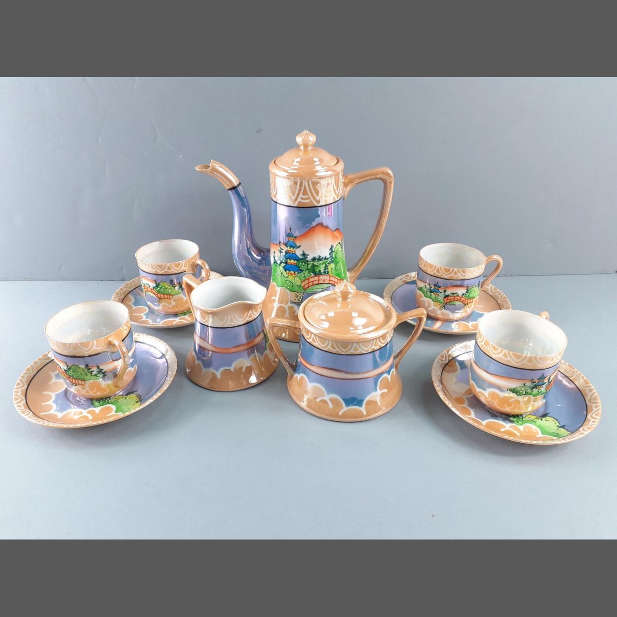 A beautiful CHIKARAMACHI Japanese coffee set comprising coffee pot with lid, sugar and cream and six coffee cups / cans with saucers. Gorgeous Pagoda with bridge pattern and the set is in excellent undamaged condition with no chips or cracks.