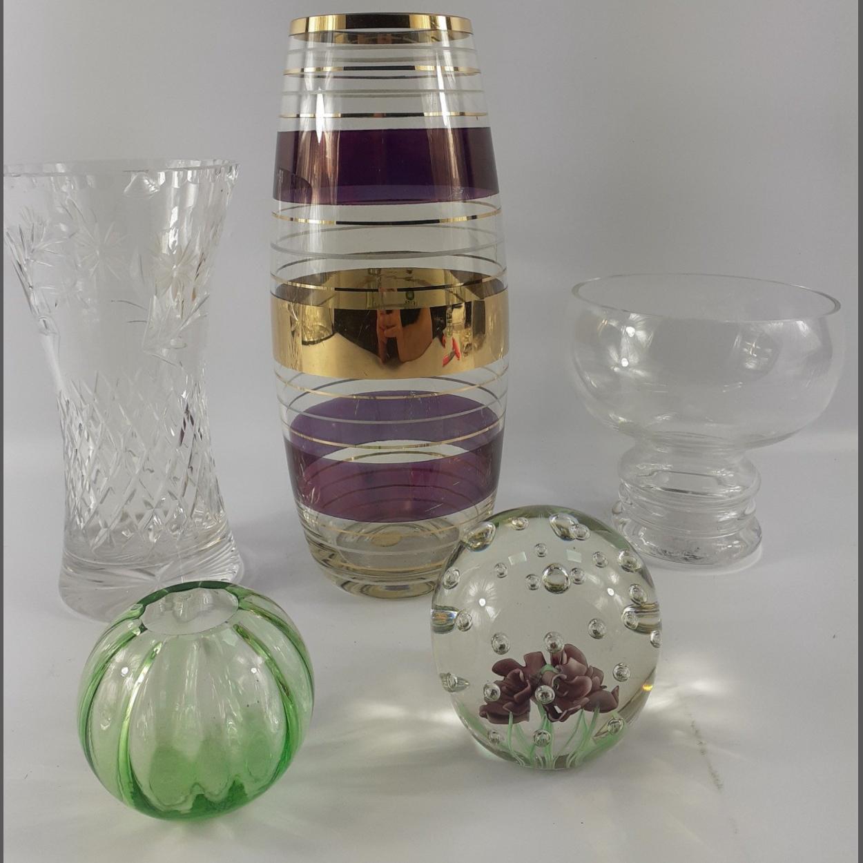 A collection of pretty glass items to include a 1970s style Romanian 26cm vase, a floral etched crystal vase, a paperweight and others.
