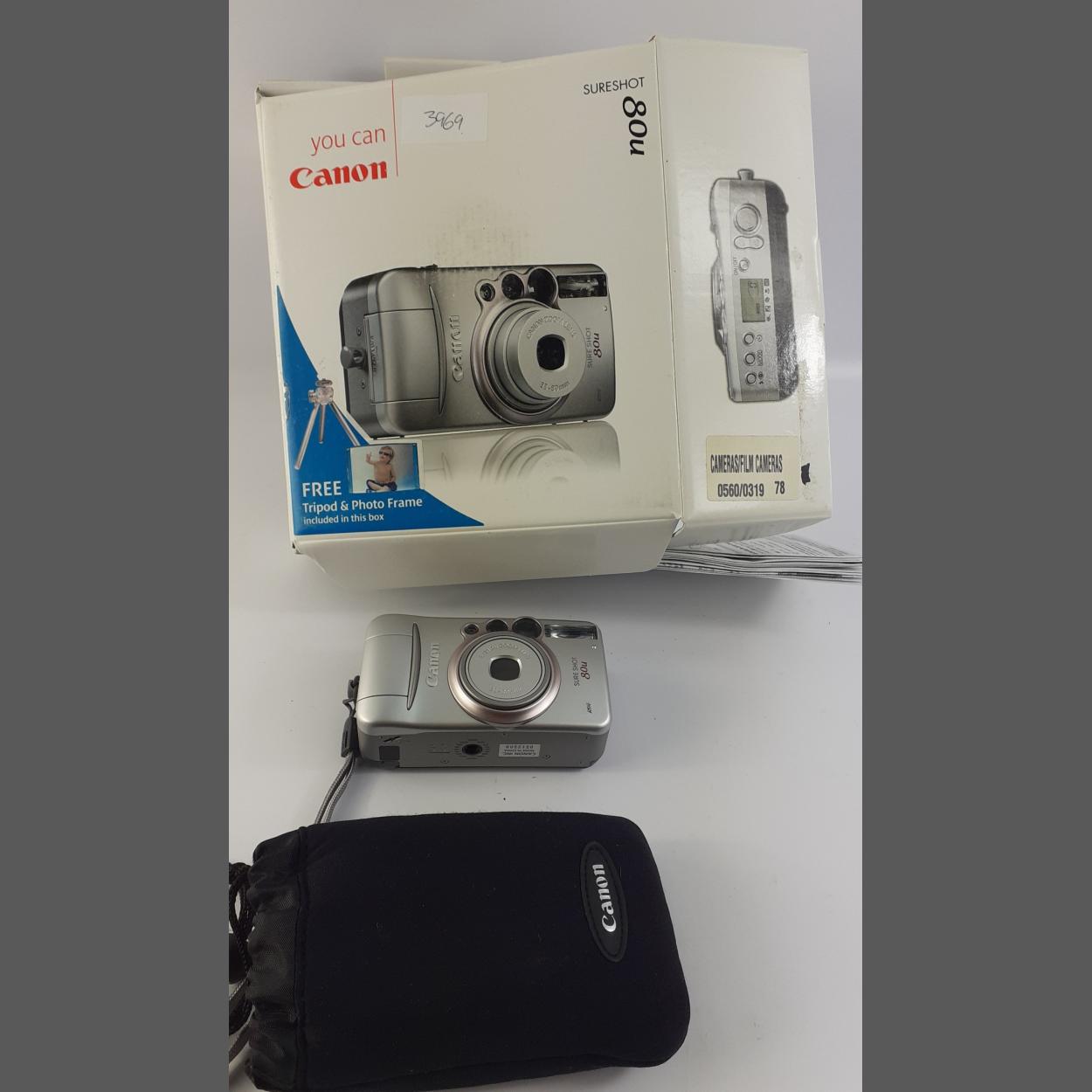 A boxed CANON Sureshot 80U 35mm camera, complete with carry case and tripod